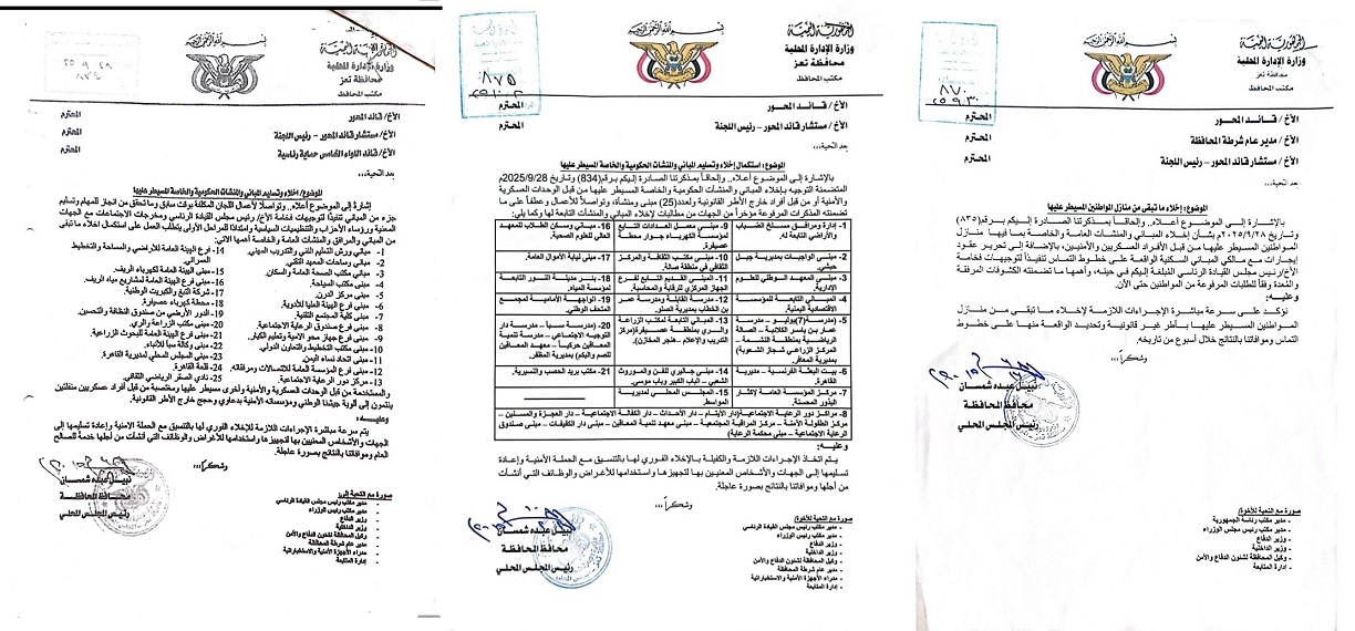 كما وجه المحافظ قيادة المحور والأمن بتوجيه ثالث بإخلاء ما تبقى من منازل المواطنين المسيطر عليها من قبل الأفراد العسكريين والأمنيين، بالإضافة إلى تحرير عقود إيجارات مع مالكي المباني السكنية الواقعة على خطوط التماس تنفيذاً لتوجيهات رئيس مجلس القيادة الرئاسي (اثناء زيارته لتعز العام الماضي).
