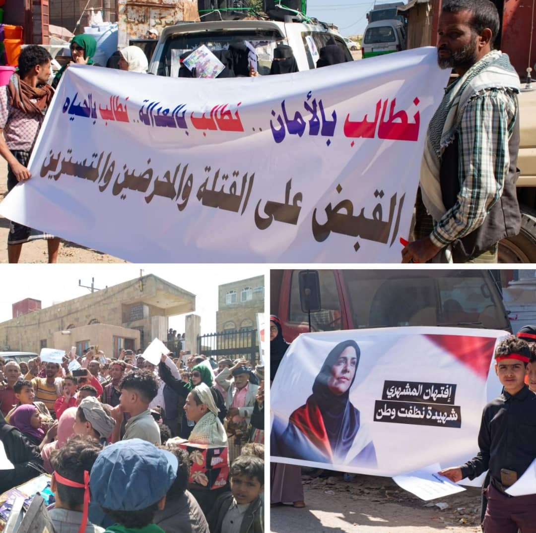 وتوجه المشاركون في المسيرة من أمام مبنى إدارة أمن مديرية الشمايتين نحو مبنى المحكمة في مركز المديرية، حاملين صور ضحايا الانفلات الأمني، وعلى رأسهم الشهيدة أفتِهان المشهري.