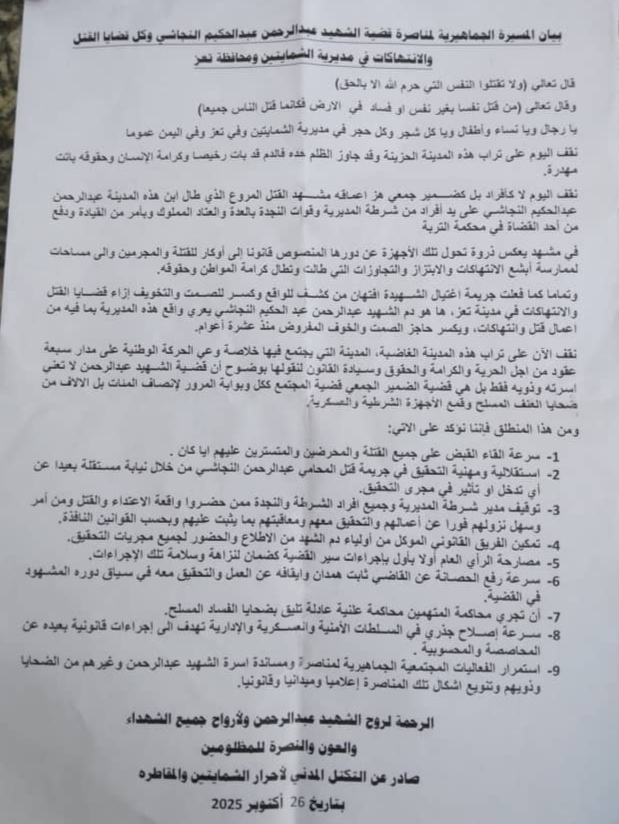 كما شددوا على تمكين الفريق القانوني الموكل من أولياء دم الشهيد من متابعة مجريات التحقيق والاطلاع على جميع الإجراءات، ومصارحة الرأي العام أولًا بأول لضمان نزاهة وشفافية العملية القضائية.