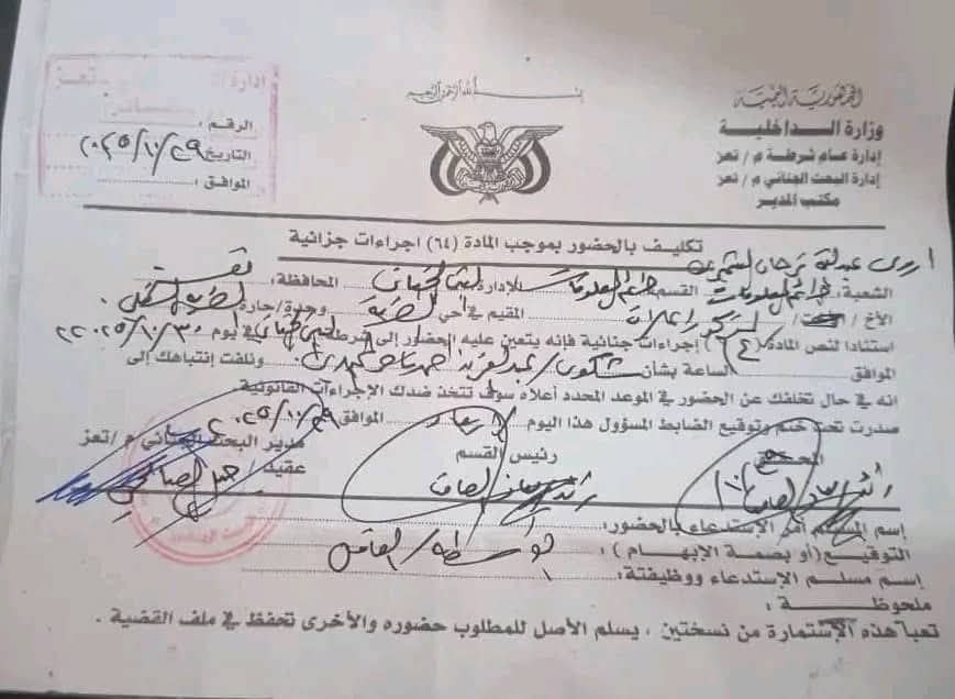 وتلقت الشميري امس الأربعاء طلب حضور من البحث الجنائي ، بناءً على شكوى ضدها من قبل أركان محور تعز العميد / عبدالعزيز المجيدي.
