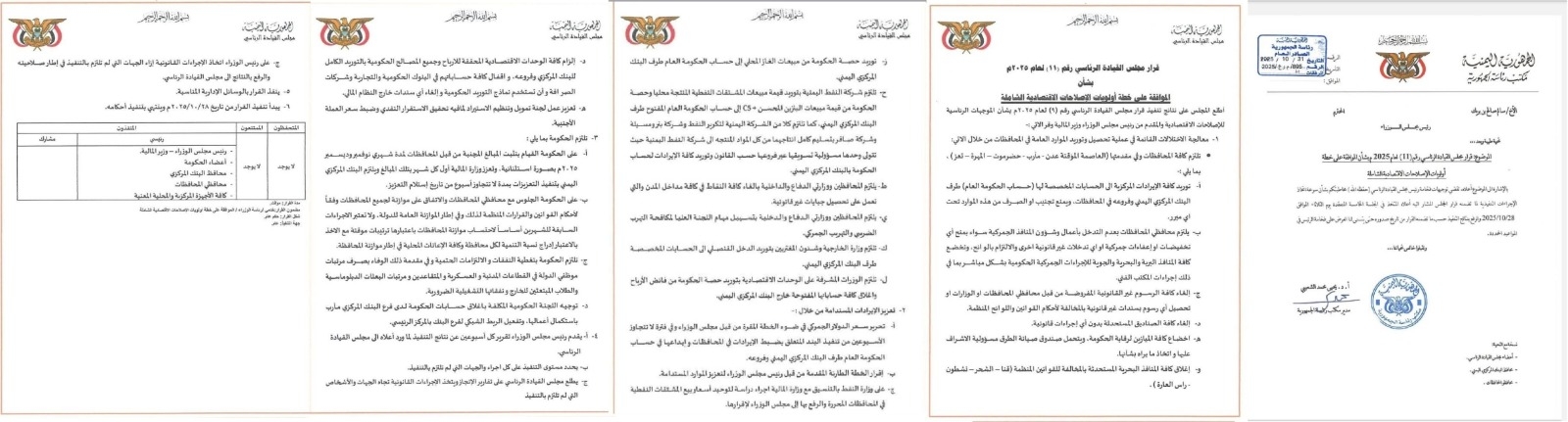 أطلع المجلس على نتائج تنفيذ قرار مجلس القيادة الرئاسي رقم (۹) لعام ۲۰۲٥م بشأن الموجهات الرئاسية للإصلاحات الاقتصادية والمقدم من رئيس مجلس الوزراء وزير المالية وأقر الآتي: