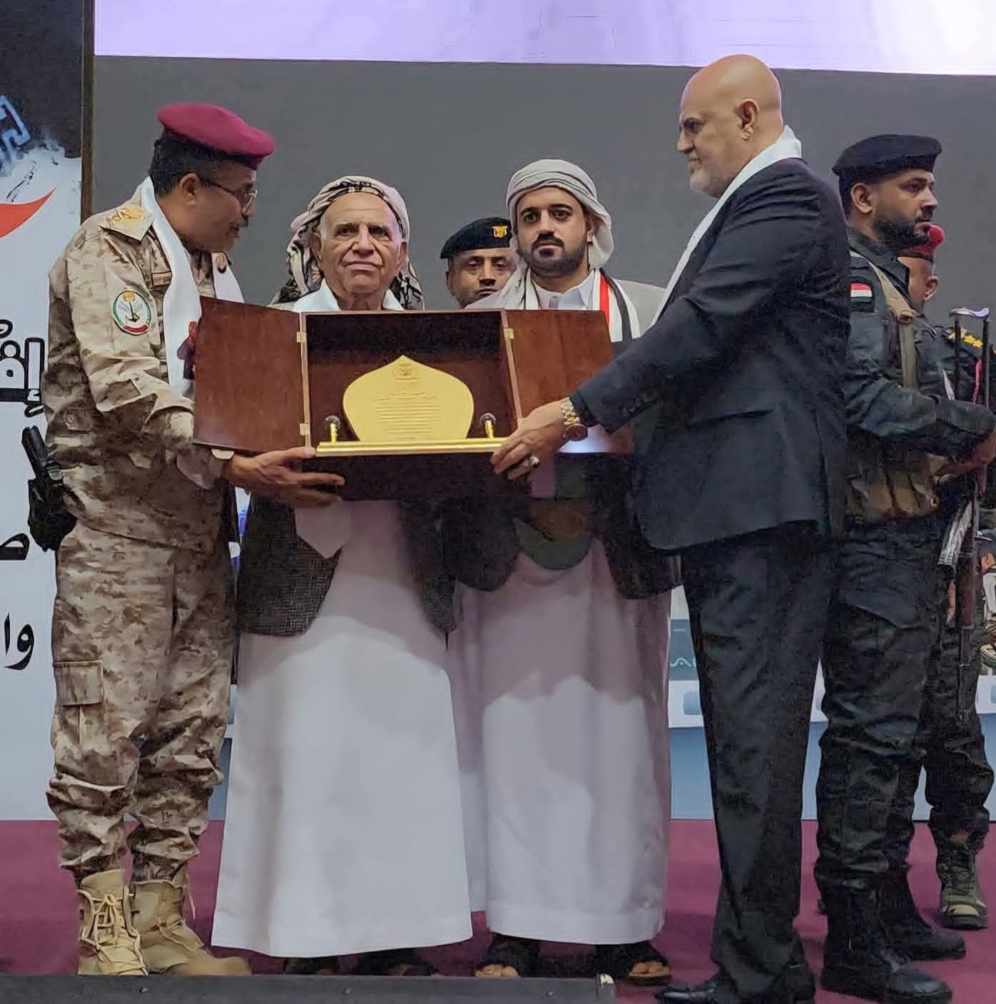 وسلّم محافظ محافظة تعز، ومعه اللواء عبدالعزيز المجيدي أركان حرب محور تعز، درع الوفاء والواجب لوالد الشهيدة إفتهان المشهري تقديرًا لدوره الوطني الكبير.