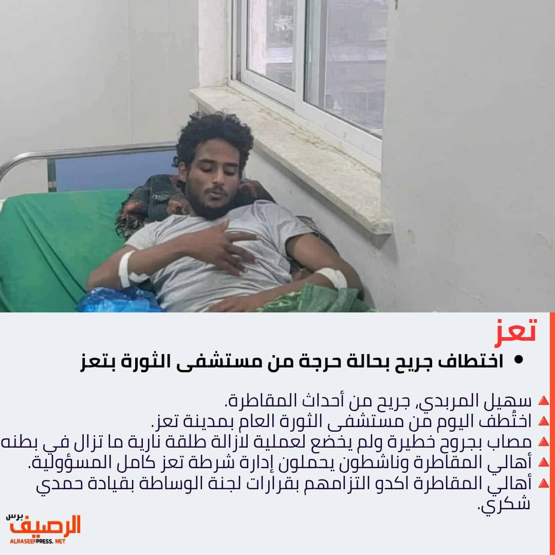 داهم مسلحون يعتقد أنهم تابعون لشرطة محافظة تعز هيئة مستشفى الثورة العام بمدينة تعز، واختطفوا الجريح سهيل المربدي، الذي أصيب في أحداث المقاطرة، واقتادوه إلى جهة مجهولة.