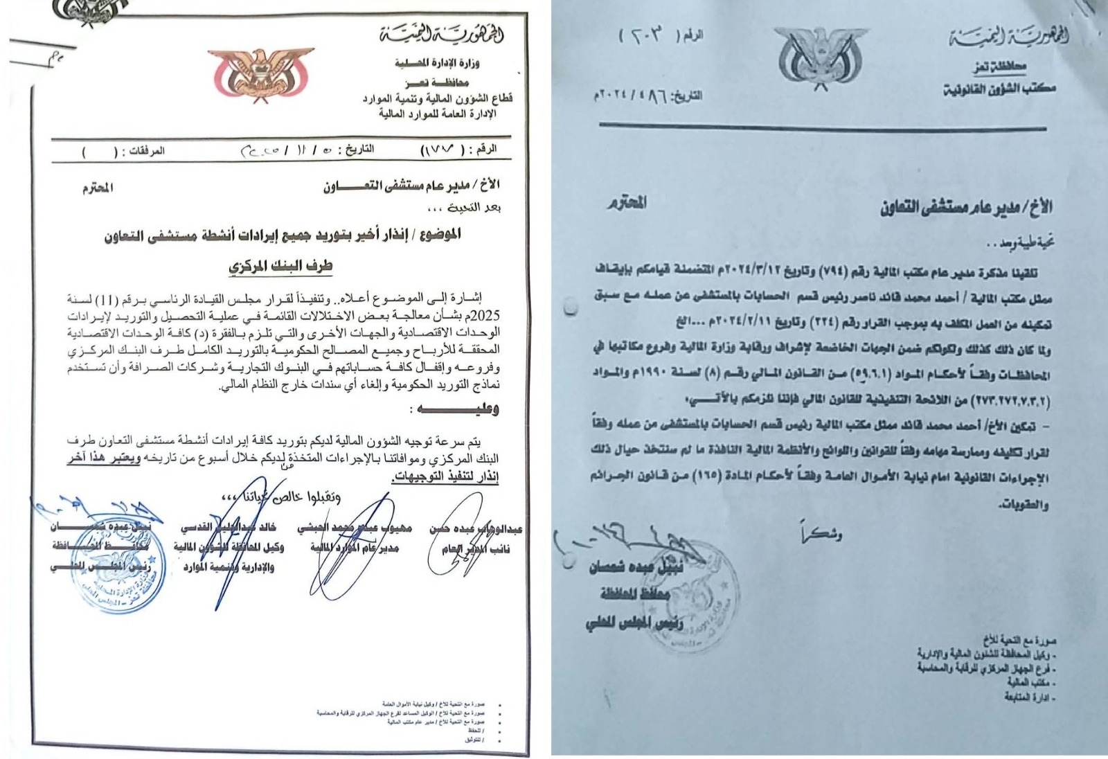 وتظهر الوثائق ، توجيه محافظ تعز نبيل شمسان مطلع الشهر الجاري إنذار أخير لمدير عام مستشفى التعاون  بتوريد جميع إيرادات أنشطة المستشفى الى طرف البنك المركزي بالمحافظة.