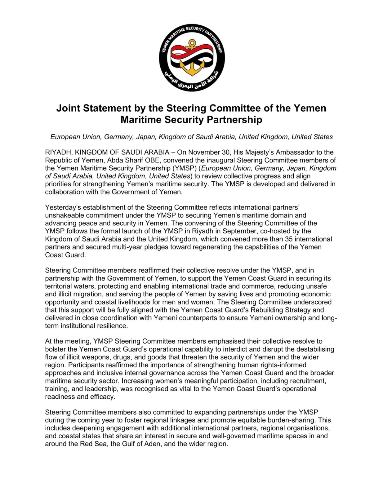 اللجنة التي تُعرف بـ (YMSP) ، تضم كل من الاتحاد الأوروبي، ألمانيا، اليابان، المملكة العربية السعودية، المملكة المتحدة، الولايات المتحدة الأمريكية ، وقالت في بيان صادر عن الاجتماع بأنها ناقشت التقدم الجماعي ومواءمة الأولويات لتعزيز الأمن البحري في اليمن.