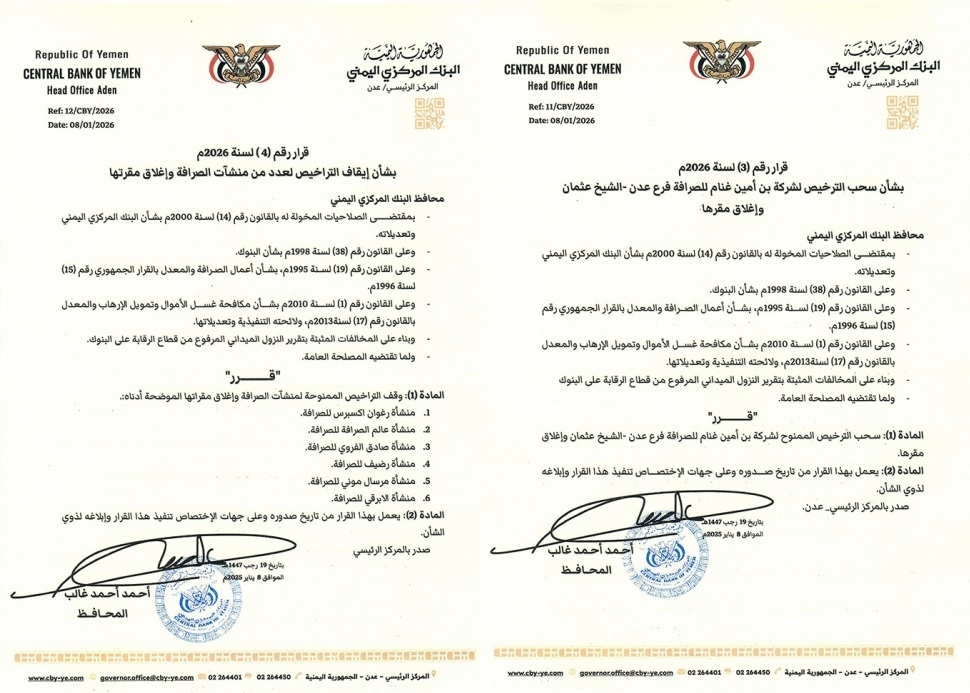 أصدر محافظ البنك المركزي أ. أحمد أحمد غالب قرار رقم (4) لعام 2026م، بشأن إيقاف التراخيص الممنوحة لعدد من منشآت الصرافة ، وهي :
