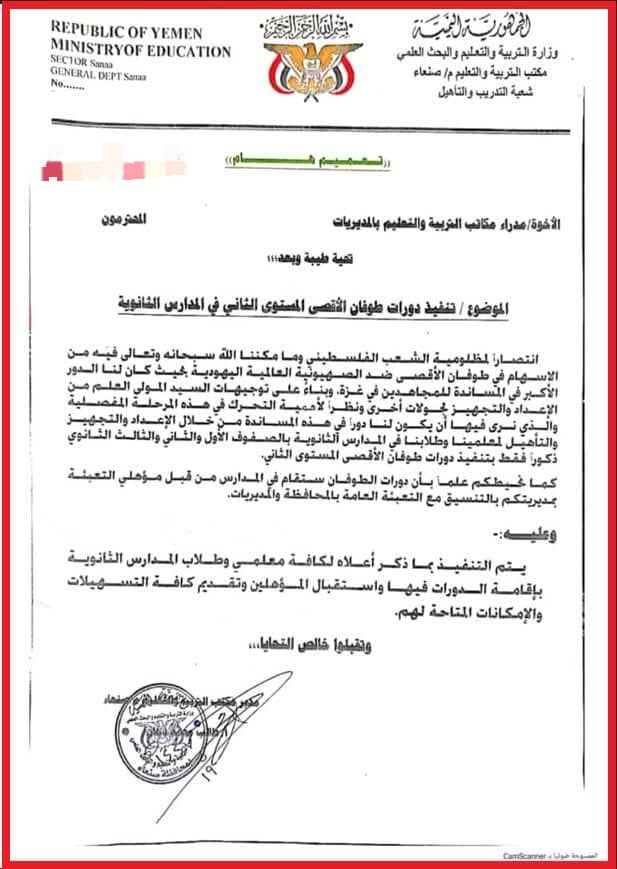 وجّه مكتب التربية والتعليم الخاضع لسيطرة مليشيا الحوثي الإرهابية في محافظة صنعاء تعميماً إلى مدراء مكاتب التربية والتعليم في المديريات، يقضي بتنفيذ دورات طائفية جديدة تستهدف معلمي وطلاب المدارس الثانوية، تحت مسمى «طوفان الأقصى – المستوى الثاني».