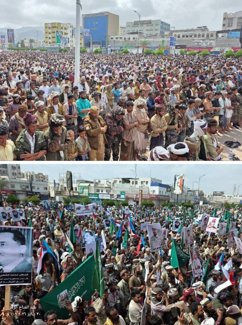 قبيلة الصبيحة تقود حشودًا غاضبة في ساحة العروض بعدن للتنديد بمحاولة اغتيال حمدي شكري