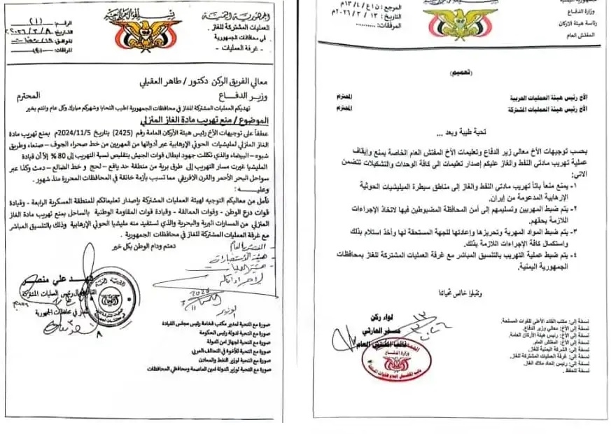 حيث وجه رئيس غرفة العمليات المشتركة للغاز فهد منصر ، خطاباً الى وزير الدفاع / طاهر العقيلي ، كشف فيه عن وجود عمليات تهريب للغاز المنزلي من المناطق المحررة الى مناطق سيطرة مليشيا الحوثي.