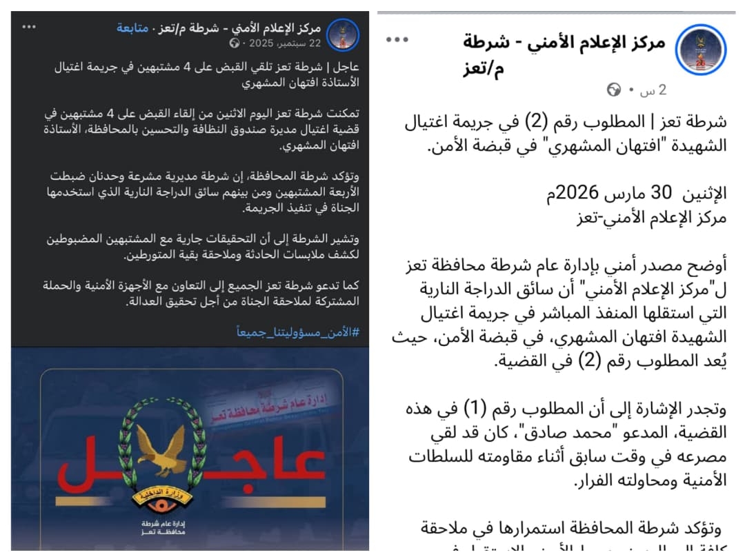 للمرة الثانية .. شرطة تعز تُعلن القبض على المتهم الثاني باغتيال أفتِهان المشهري