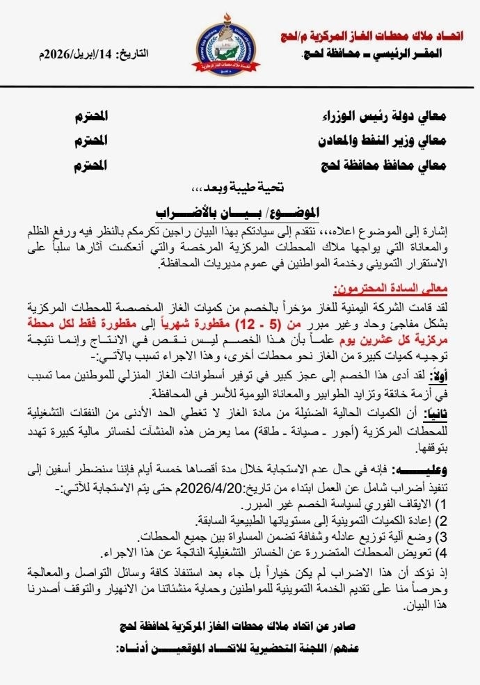 مشيرين في خطاب الى رئيس الحكومة بأن الشركة اليمنية للغاز قامت مؤخراً بالخصم من كميات الغاز المخصصة للمحطات المركزية بشكل مفاجئ وحاد وغير مبرر.