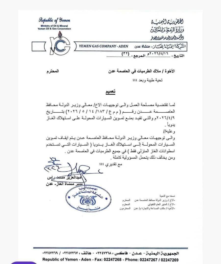 تعديل في توجيهات لمحافظ عدن حول تموين السيارات العاملة بالغاز – وثيقة