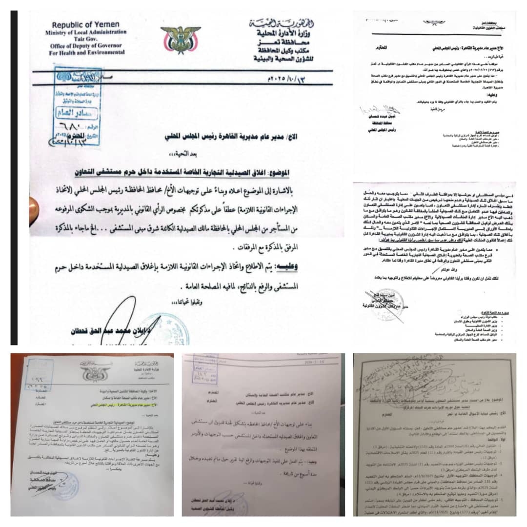 مدير القاهرة بتعز يعرقل تنفيذ قرار إغلاق صيدلية خاصة بمدير مستشفى التعاون داخل المستشفى – وثائق