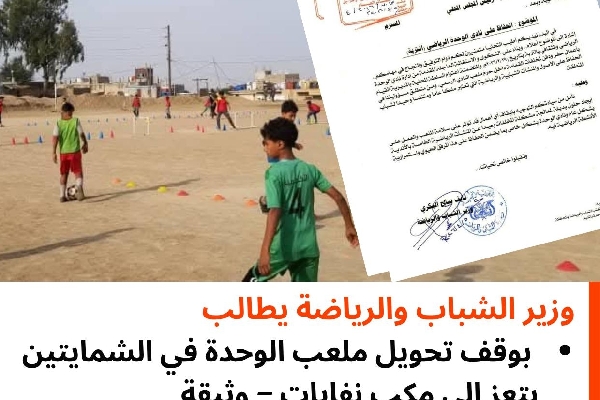 وزير الشباب والرياضة يطالب بوقف تحويل ملعب الوحدة في الشمايتين بتعز إلى مكب نفايات