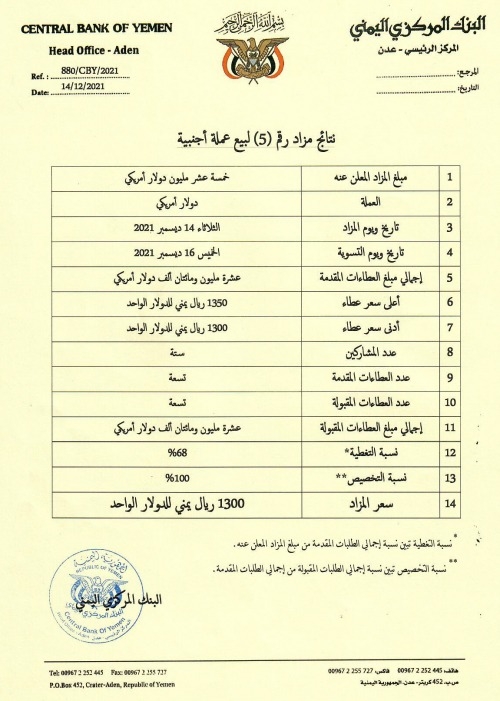 أعلن البنك المركزي في عدن، اليوم الثلاثاء، عن نتائج المزاد الخامس لبيع 15 مليون دولار للبنوك التجارية عبر منصة الكترونية أمريكية.