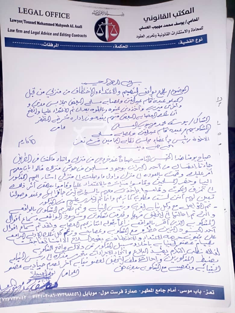 واشار العسلي في بلاغه المقدم الى نقابة المحاميين بتعز إنه تم التواصل مع رئيس النيابة ووكيل نيابة الغرب وتقديم شكوى بالواقعة.