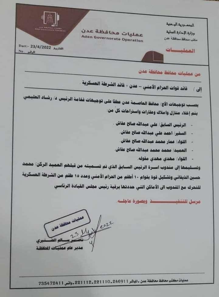 نفت عمليات محافظة عدن صحة البرقية المنسوبة لها والمتضمنة توجيهات بإخلاء منازل تتبع الرئيس الأسبق علي صالح واولاده واقاربه في عدن بتوجيهات من رئيس المجلس الرئاسي رشاد العليمي.