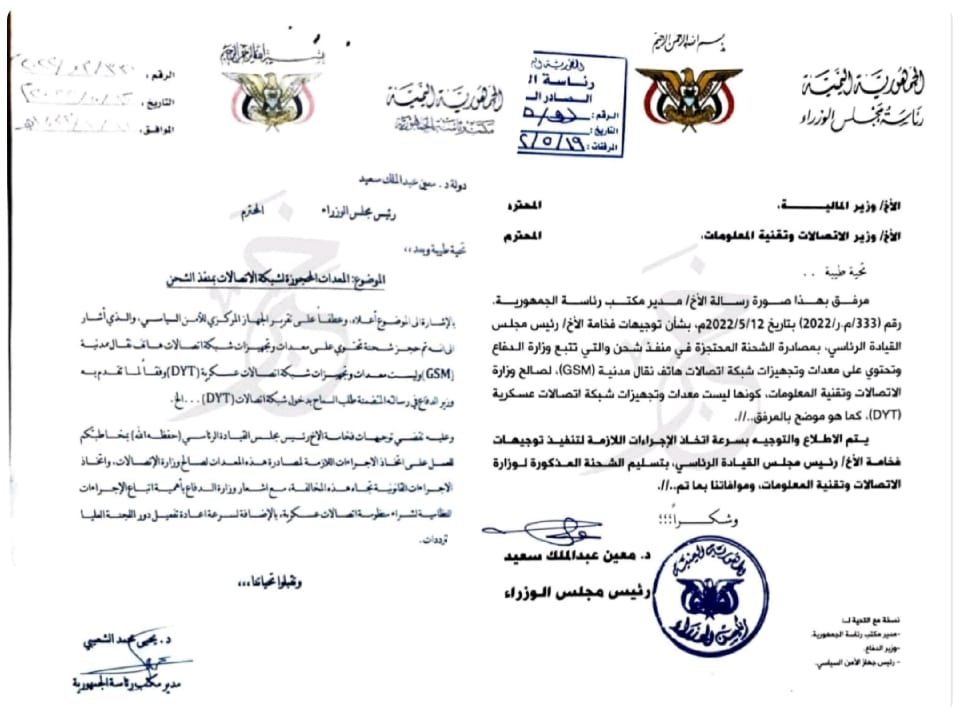 ووفق الوثيقة فقد أشار الشعيبي الى توجيهات من رئيس المجلس الرئاسي بمصادرة الأجهزة والمعدات لصالح وزارة الاتصالات، وبدوره وجه رئيس الوزراء كل من وزير الاتصالات ووزير المالية بتنفيذ ذلك.