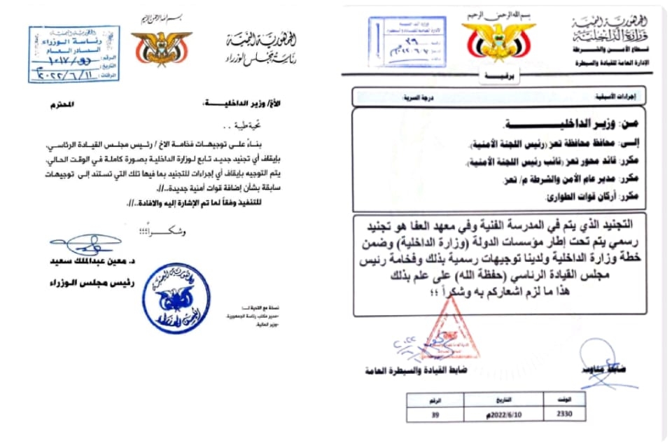 وجاء هذه التوجيهات عقب خطاب وجهه وزير الداخلية الى محافظ تعز وقائدي المحور والأمن بالمحافظة، قال فيه بأن عمليات التجنيد التي تتم في "المدرسة الفنية" و"معسكر العفا" بمديرية الشمايتين ، بأنه تجنيد رسمي تحت إطار وزارة الداخلية.