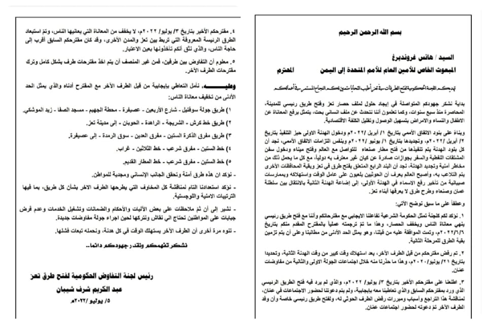 وأوضح البيان بأن مقترح المبعوث الأممي الجديد، لم يشتمل على فتح طريق رئيسي إلى تعز، كما كان الحال في المقترح السابق المقدم من قبله والذي تم القبول به من قبل الوفد الحكومي ورفضه وفد الحوثي.
