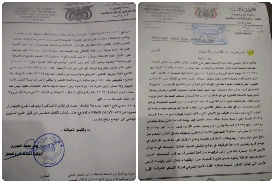 الجهاز المركزي بتعز يكشف تورط الأوقاف في عملية تحايل للسيطرة على مقبرة بريف تعز - وثائق