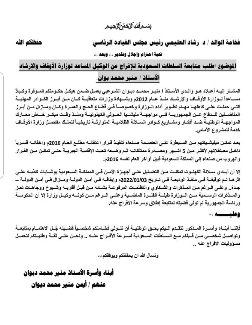 بعثت أسرة وكيل وزارة لدى الحكومة اليمنية يقبع داخل سجون المعتقلات السعودية منذ قرابة 12 شهرا مناشدة لرئيس المجلس الرئاسي للتحرك لدى السلطات السعودية للإفراج عنه.