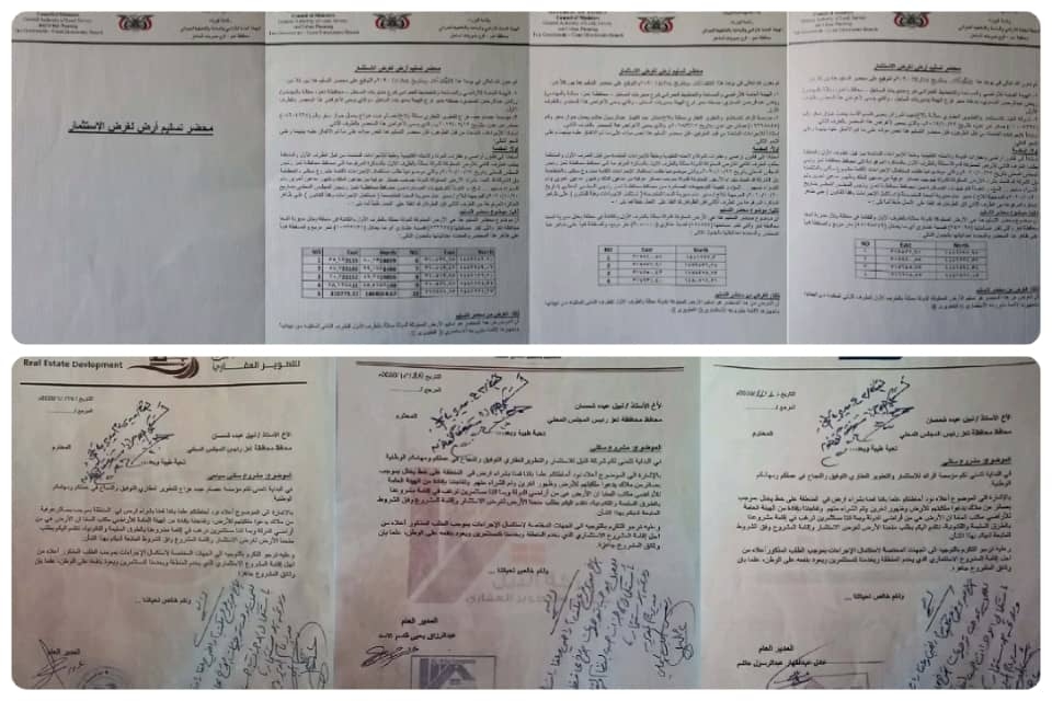 وتكشف الوثائق قيام فرع الهيئة العامة الأراضي والمساحة والتخطيط العمراني في مديريات ساحل تعز بتسليم مساحات واسعة تفوق الـ 35 مليون متر مربع من أراضي الدولة الى 3 شركات غير معروفة تحت ذريعة الاستثمار وانشاء مدن سكنية.