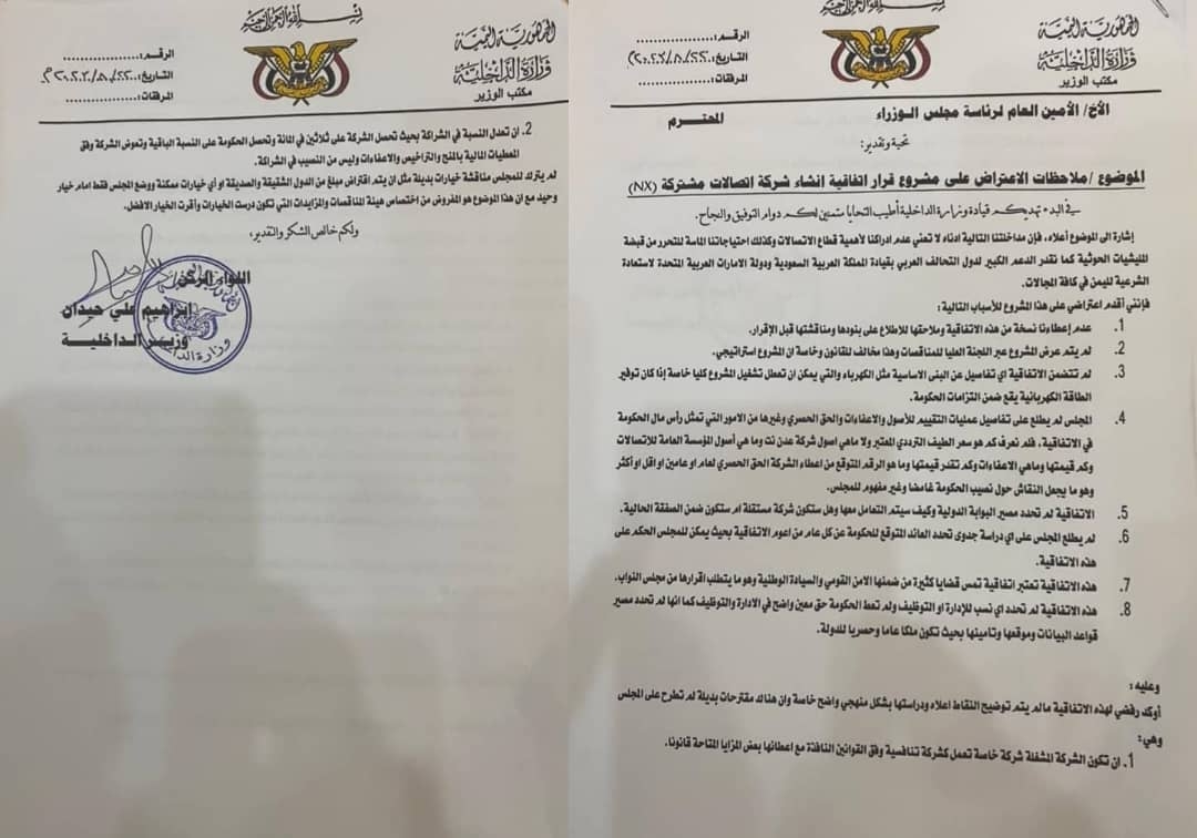 في أحدث المواقف التي تكشف حقيقة المعارضة لاتفاقية انشاء شركة اتصالات مشتركة مع شركة (NX) الإماراتية ، أعلن وزير الداخلية الإخواني اللواء / إبراهيم حيدان موقفه المعارض والرافض للاتفاقية رغم الإعلان الرسمي عن موافقة الحكومة على الاتفاقية باجتماعها الأخير.