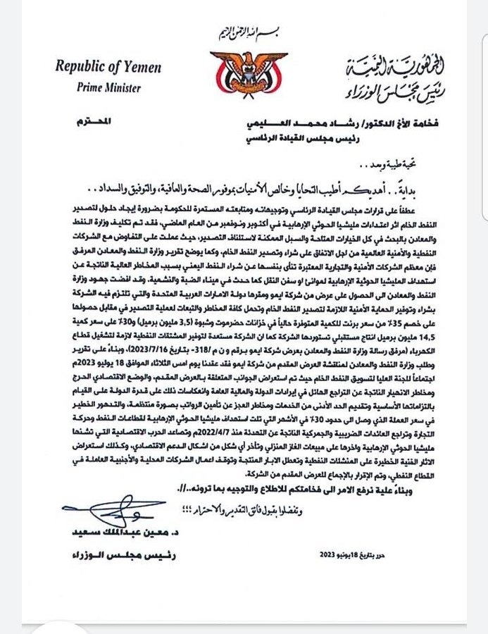 ووفق الوثيقة ، كشف رئيس الوزراء عن محاولات حكومية مستمرة لتعامل مع هجمات مليشيات الحوثي على موانئ تصدير النفط والتي تسببت بوقف التصدير نهائياً منذ عام ، ورفض شركات نفطية وأمنية عالمياً جرى التخاطب معها لإعادة التصدير.
