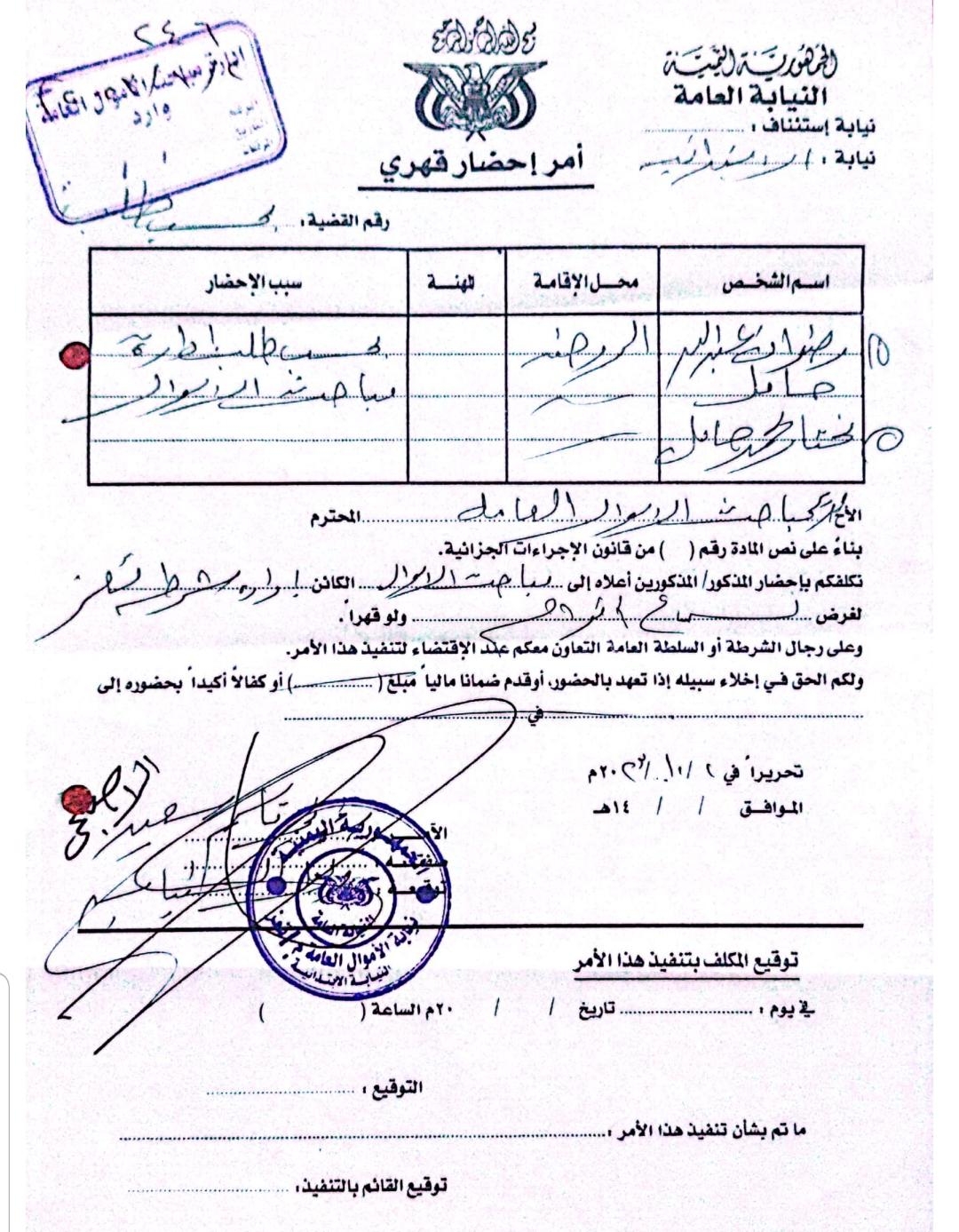 وكانت النيابة العامة أصدرت أوامر قهرية بحق قائد العصابة المسلحة رضوان جامل، واحضاره لمباحث الأموال العامة، مع شخص اخر يدعى مختار محمد جامل بتاريخ 2 أكتوبر2023 إلا ان نفوذ الوكيل جامل وقفت عائقاً أمام تنفيذ أوامر النيابة.
