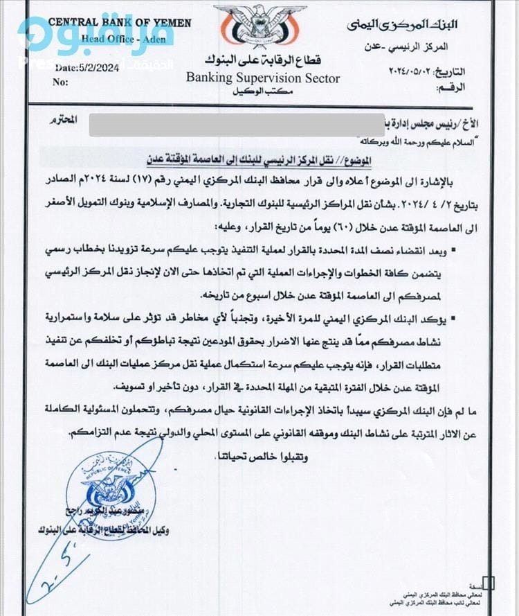البنك المركزي يحذر البنوك التجارية من عدم نقل مقراته لعدن – وثيقة