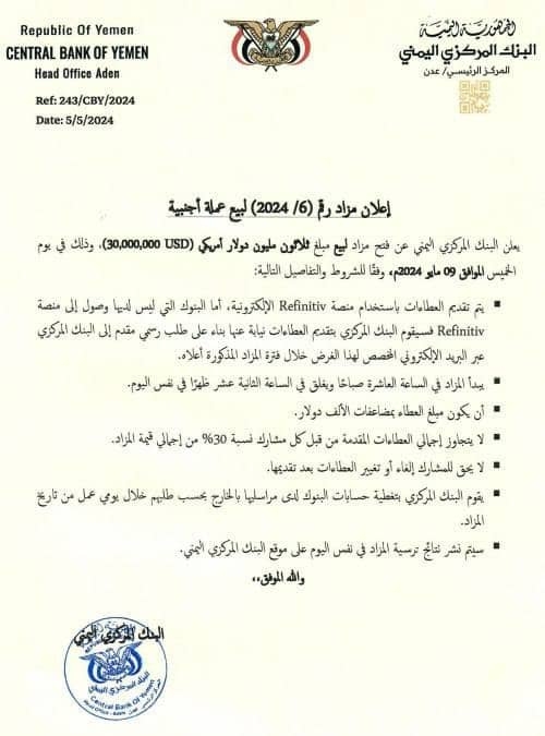 أعلن البنك المركزي اليمني في العاصمة المؤقتة عدن، اليوم الأحد، عن فتح مزاد لبيع ثلاثين مليون دولار يوم الخميس القادم بعد توقف لأكثر من شهر.