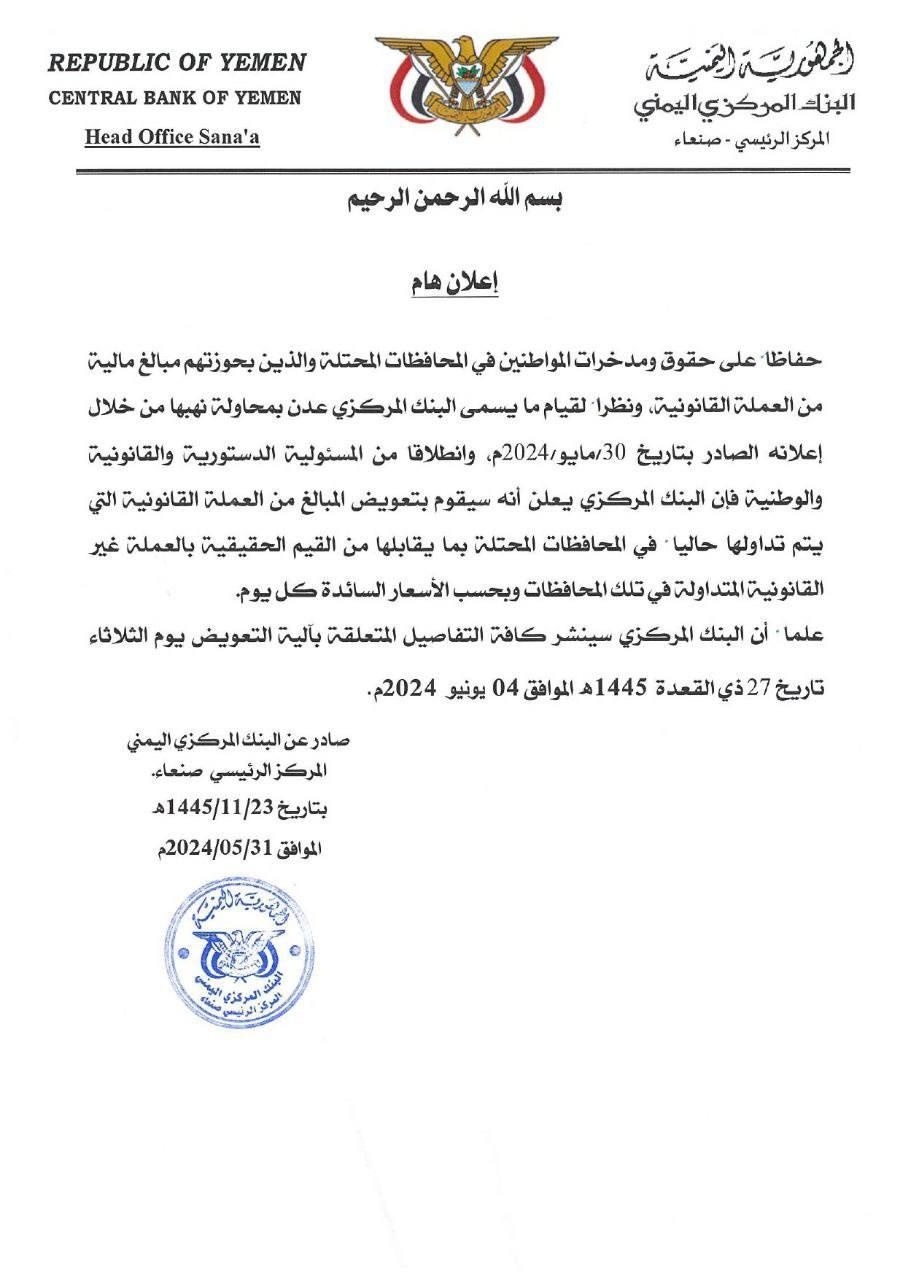 اعلان من بنك الحوثي بصنعاء حول العملة القديمة
