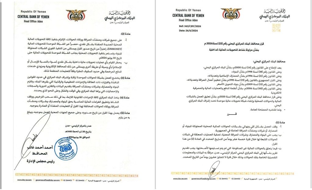 وقضت المادة الأولى من القرار الذي حمل رقم 23 لسنة 2024م، بوقف العمل بشكل كلي ونهائي بشبكات الحوالات المالية المحلية المملوكة للبنوك والمصارف أو شركات ومنشآت الصرافة العاملة في الجمهورية.