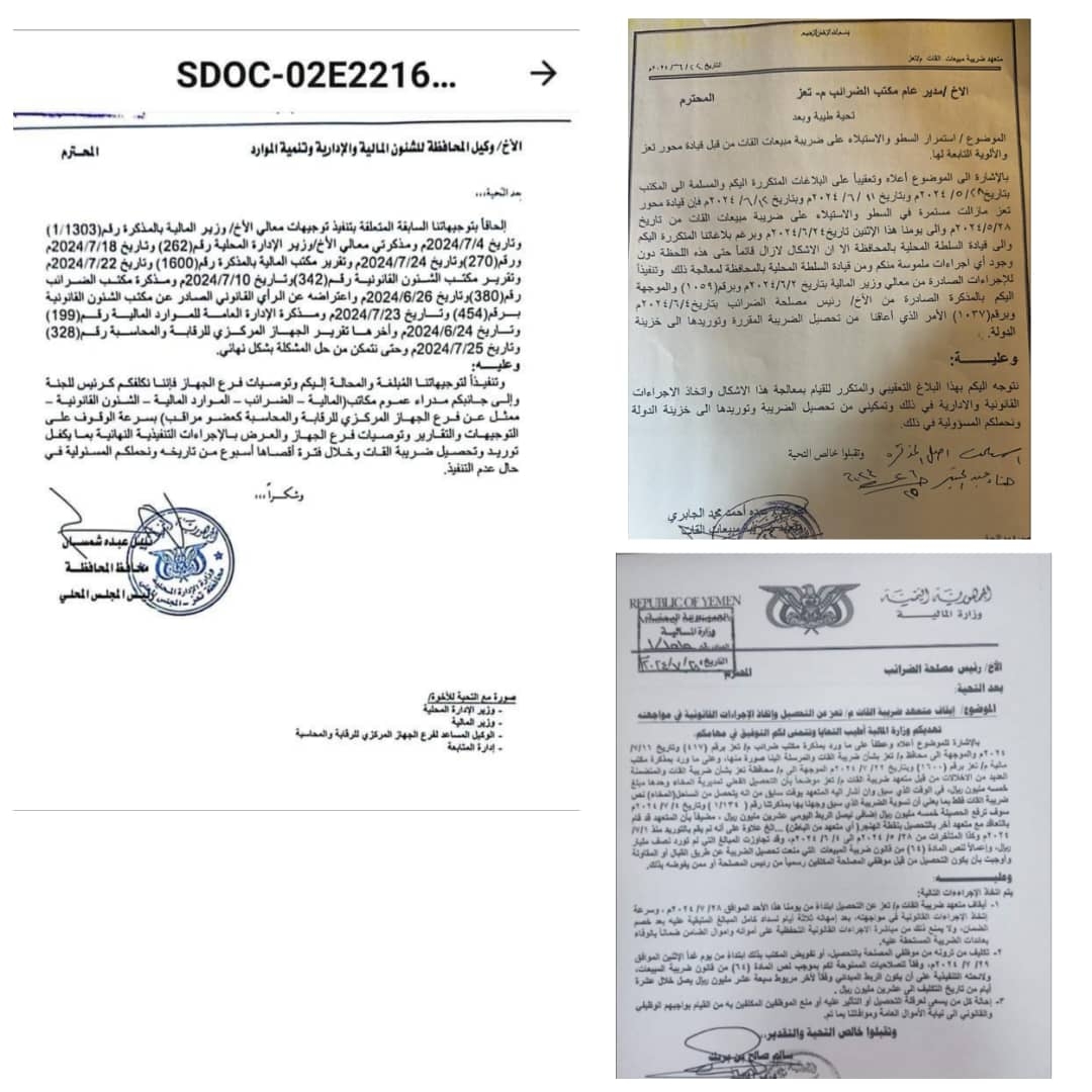 وعطفاً على هذه التوجيهات ، كشفت وثيقة رسمية حصل عليها "الرصيف برس" عن توجيهات لمحافظ تعز الى وكيل المحافظة للشئون المالية والإدارية وتنمية الموارد ، لحل مشكلة تحصيل ضريبة القات بالمحافظة بشكل نهائي ، اشارت الى توجيهات وزير المالية وتوجيهات ومراسلات سابقة وتقرير حديث صادر عن الجهاز المركزي.