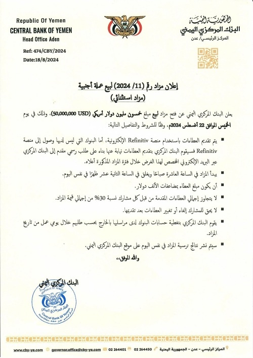 اعلن البنك المركزي اليمني بالعاصمة عدن اليوم الأحد عن فتح مزاد استثنائي لبيع مبلغ خمسين مليون دولار أمريكي، وذلك في يوم الخميس القادم الـ 22 أغسطس الجاري.