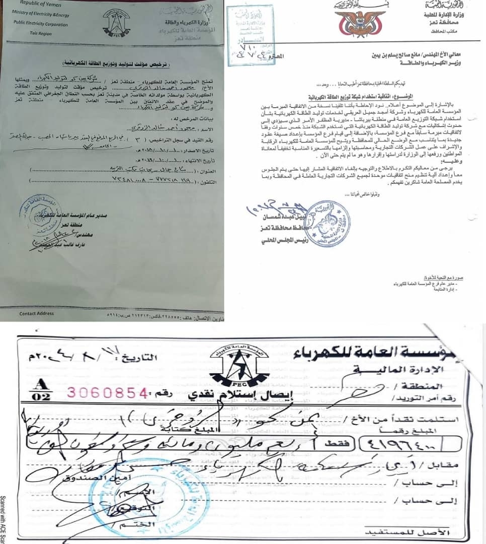 وارفقت المصادر صورة من سند استلام صادرة عن المؤسسة العامة للكهرباء في تعز لمبلغ 4 مليون ريال كرسوم ايجار للشبكة من شركة "يمن كو" في منتصف شهر أغسطس الماضي ، أي بعد أكثر من شهر على قيام مدير الفرع باستخراج العقد الجديد للشركة المستحدثة.