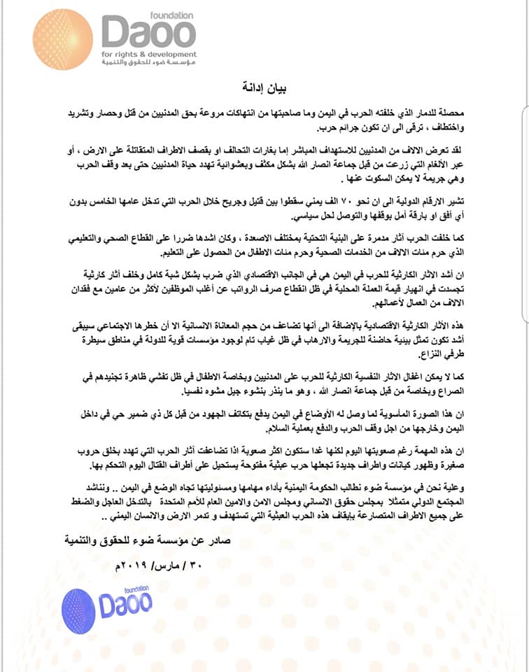 واضاف البيان : كما لايمكن اغفال الاثار النفسية الكارثية للحرب على المدنيين وبخاصة الاطفال في ظل تفشي ظاهرة تجنيدهم في الصراع وبخاصة من قبل جماعة انصار الله ، وهو ما ينذر بنشوء جيل مشوه نفسيا.