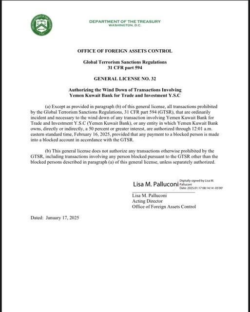 أعلن مكتب مراقبة الأصول الأجنبية التابع لوزارة الخزانة الأمريكية اليوم فرض عقوبات على بنك اليمن والكويت للتجارة والاستثمار (YSC)، لدوره في دعم مليشيا الحوثي وتمويل أنشطتها الإرهابية.