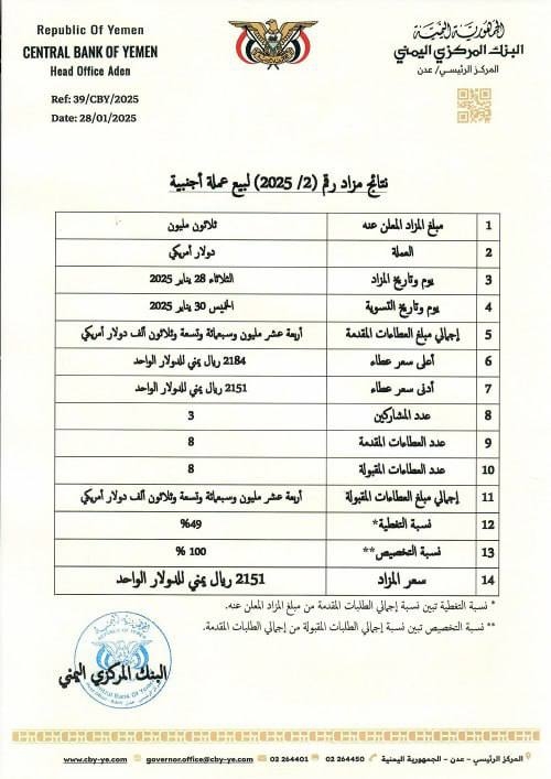 وبحسب أعلان البنك فأن عطاءات المزاد رقم (2-2025) لبيع 30 مليون دولار بلغت 14 مليوناً و739 ألف دولار، بنسبة تغطية 49% ، وبأدنى سعر قُدم في المزاد وهو 2151 ريالاً للدولار.
