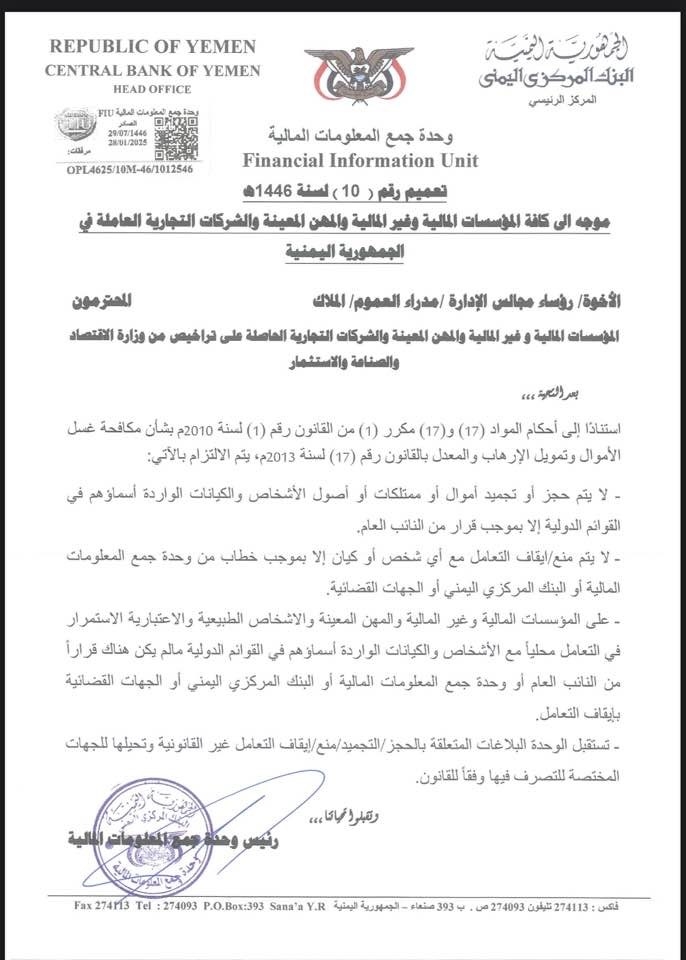 ولفت التعميم إلى أن السلطات الحوثية ستستقبل البلاغات المتعلقة بالحجز أو التجميد أو منع التعاملات غير القانونية، وستحال إلى الجهات المختصة لاتخاذ الإجراءات المناسبة وفقاً للقانون، حسب ما تم ذكره.
