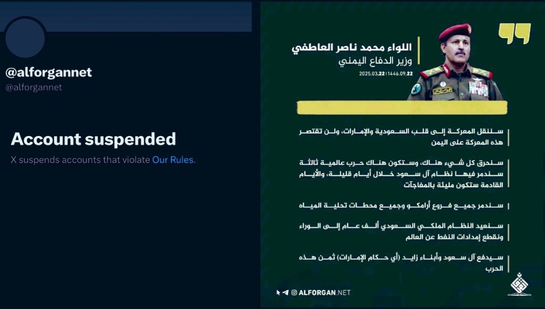 التصريحات التي نشرها حساب على منصة "أكس" محسوب على مليشيا الحوثي وعلى هيئة "انفوجرافيك" هدد فيها وزير دفاع المليشيا بتدمير أهداف حيوية في السعودية على رأسها "أرامكو" الشركة النفطية الأكبر في العالم.