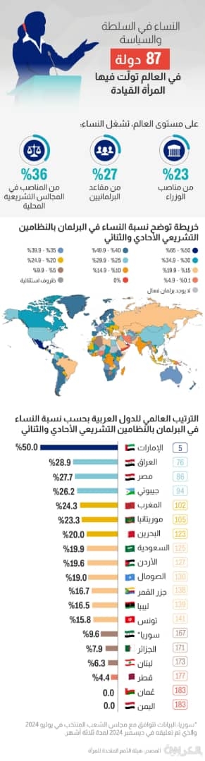 تعرّف في الإنفوغراف أعلاه إلى ترتيب الدول العربية بحسب نسبة النساء في البرلمان بالنظامين التشريعي الأحادي والثنائي:
