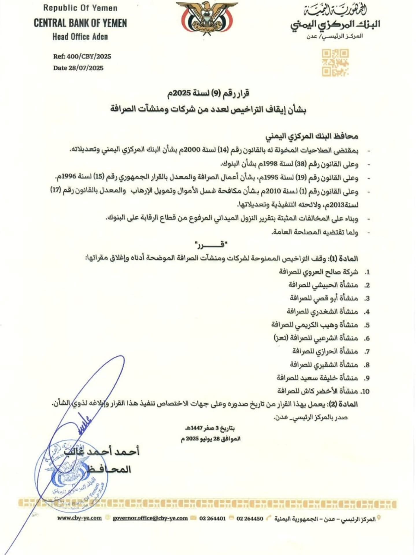 واصدر محافظ البنك المركزي قرار رقم 9 بشأن ايقاف تراخيص 10 من شركات ومنشآت الصرافة المخالفة والمثبتة بتقرير النزول الميداني المرفوع من قطاع الرقابة على البنوك.