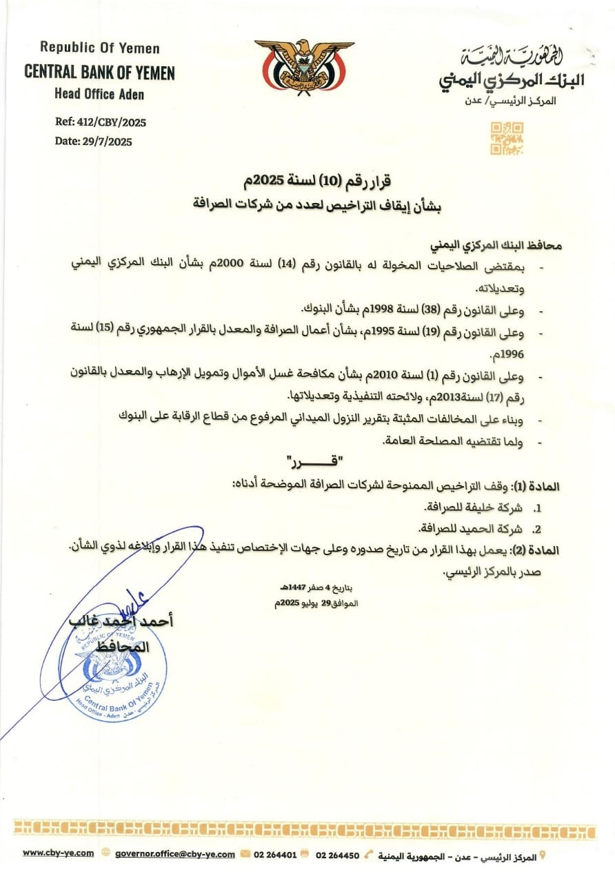 وشمل القرار الجديد الذي أصدره المحافظ احمد غالب المعبقي بوقف ترخيص شركتي الصرافة ( خليفة – الحميد ) ، بسبب المخالفة المثبتة وفق تقارير النزول الميداني المرفوع من قطاع الرقابة على البنوك.