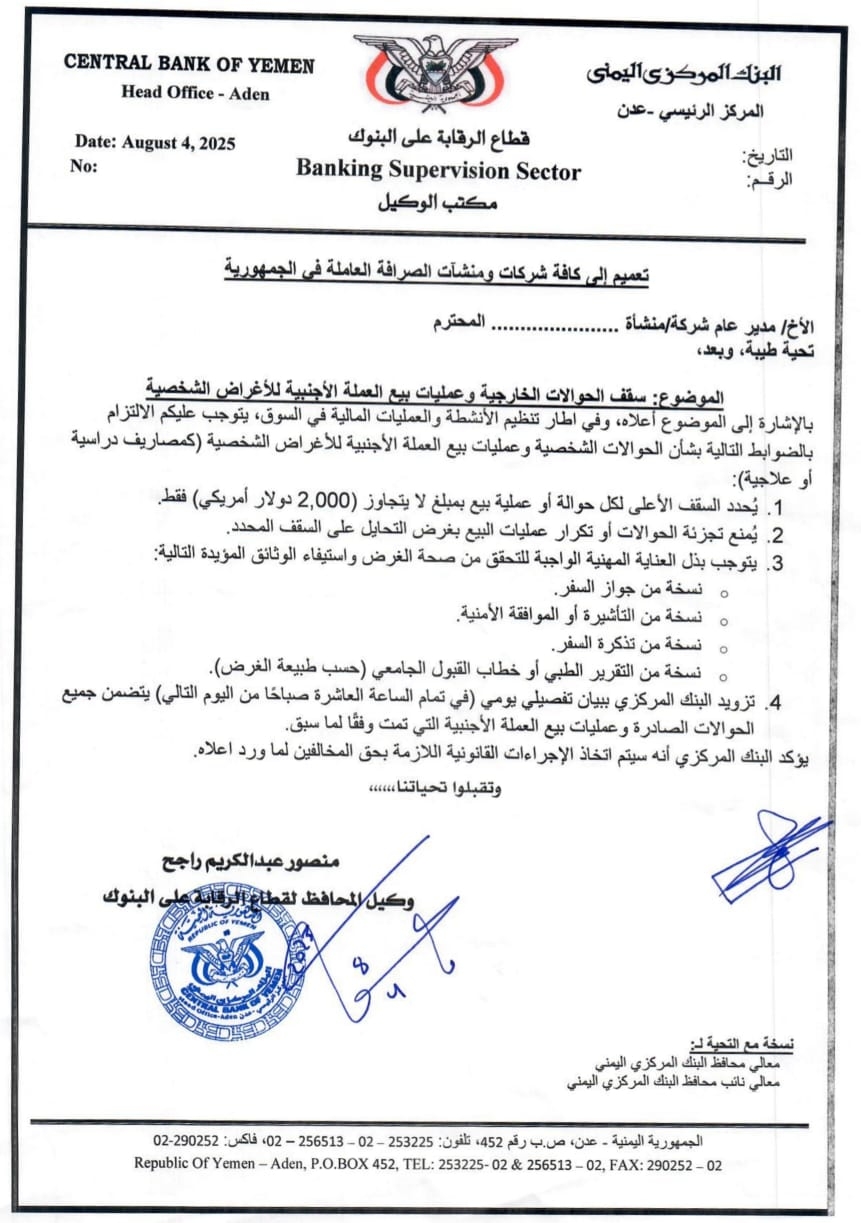 أعلن البنك المركزي اليمني في العاصمة المؤقتة عدن عن تخفيض سقف الحوالات الخارجية وعمليات بيع العملة الأجنبية للأغراض الشخصية إلى مبلغ لا يتجاوز 2000 دولار أمريكي للفرد، وذلك في إطار إجراءات تنظيم السوق وتعزيز الرقابة على النشاط المالي.