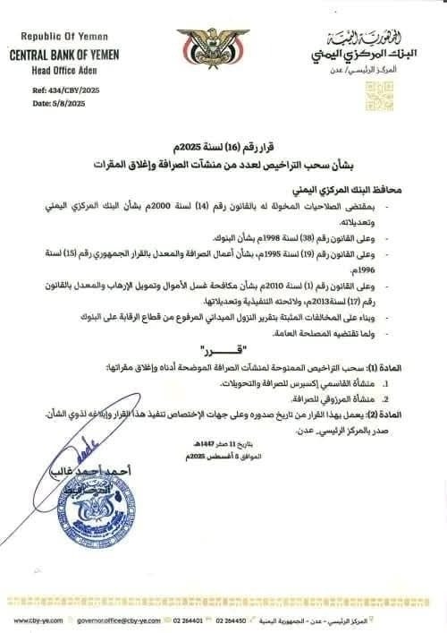 أصدر محافظ البنك المركزي اليمني احمد غالب المعبقي قراراً جديداً بحق مؤسستي صرافة ، ضمن حملة البنك لضبط السوق المصرف بالمناطق المحررة.