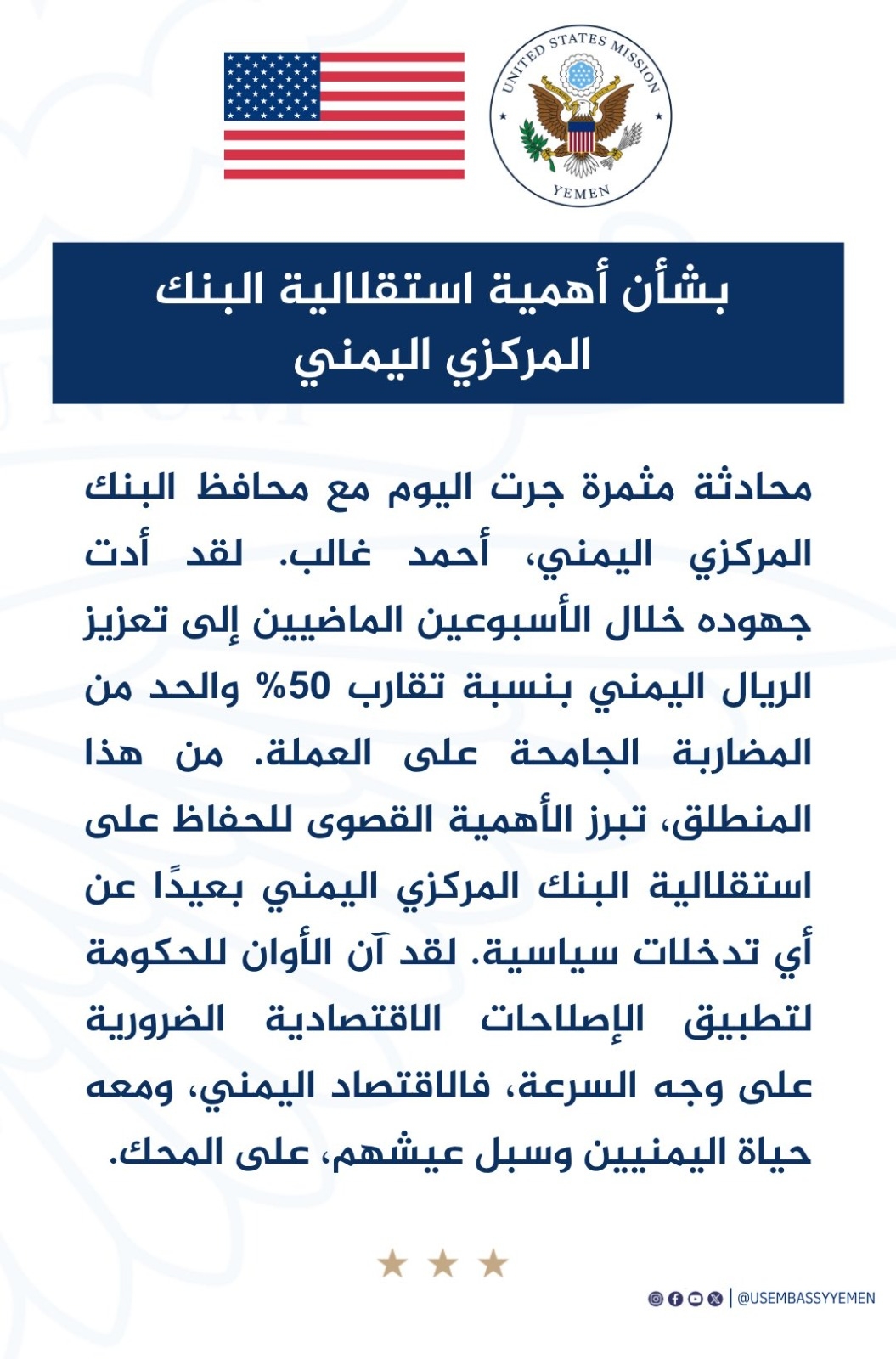 وأضافت السفارة الامريكية : من هذا المنطلق، تبرز الأهمية القصوى للحفاظ على استقلالية البنك المركزي اليمني بعيدًا عن أي تدخلات سياسية.