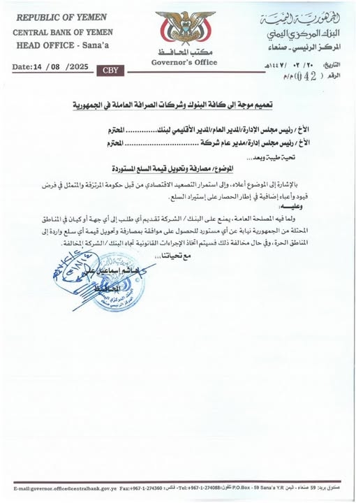 وأشار التعميم في مقدمته الى ما زعم بأنه "استمرار التصعيد الاقتصادي" من قبل الحكومة الشرعية "والمتمثل في فرض قيود وأعباء إضافية في إطار الحصار على استيراد السلع" ، حد زعمه.
