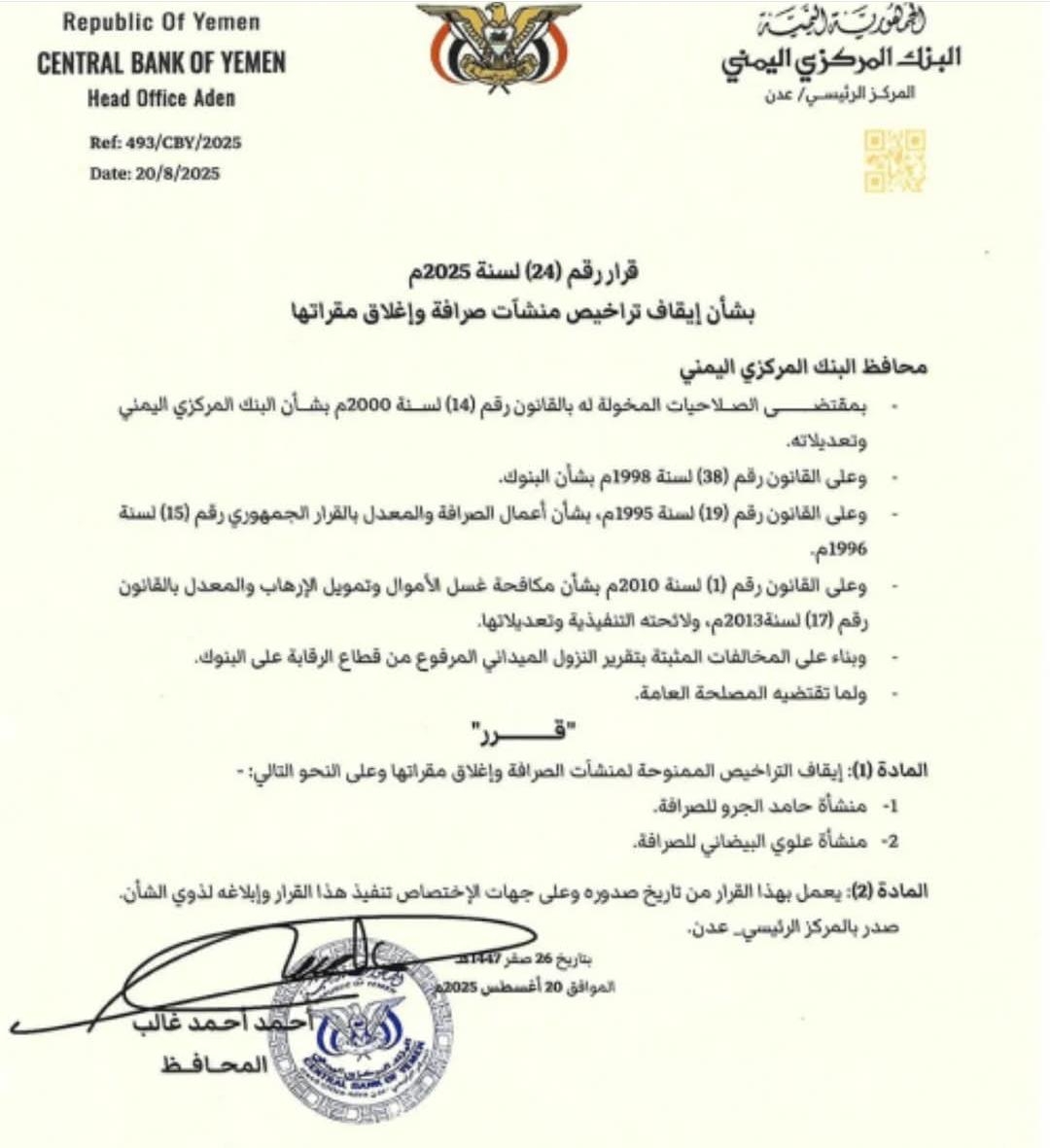 واصدر المعبقي القرار رقم (22) لسنة 2025م قضى بإيقاف التراخيص الممنوحة لمنشأة حامد الجرو للصرافة و منشأة علوي البيضاني للصرافة ، مع إغلاق مقراتهما.